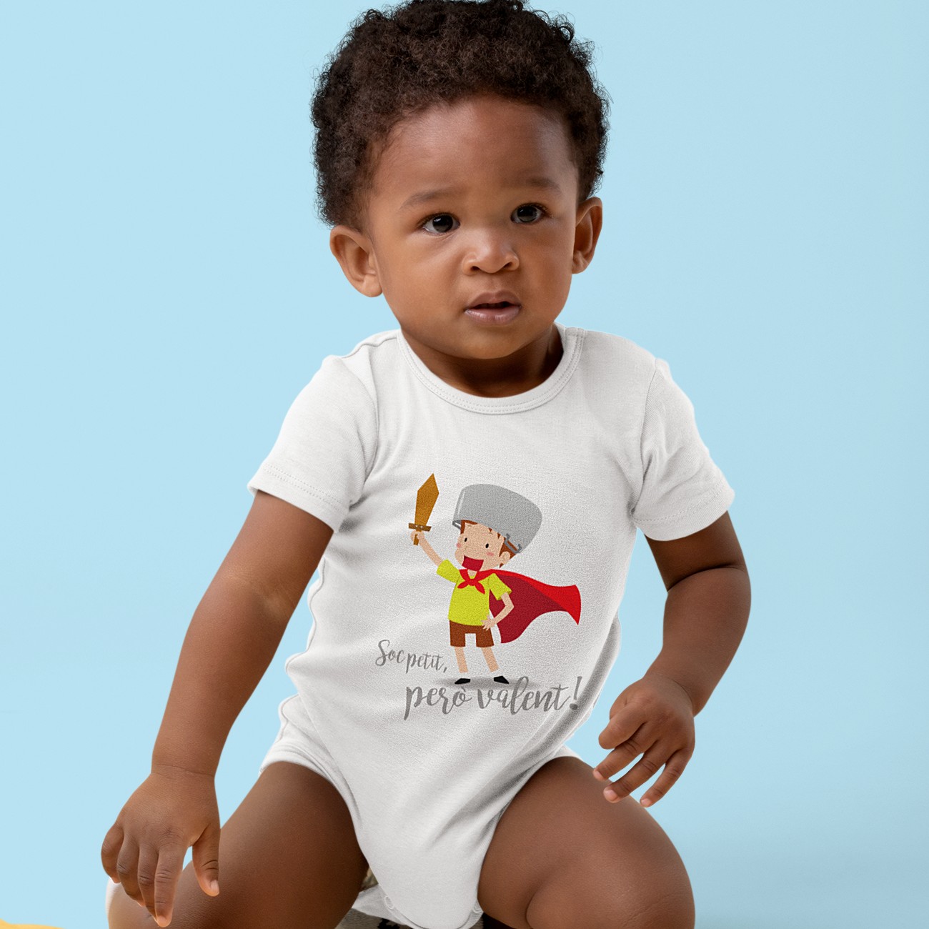 Divertit bodi per nadons amb un dibuix d’un nen amb amb espasa i capa, i una cassola al cap.
