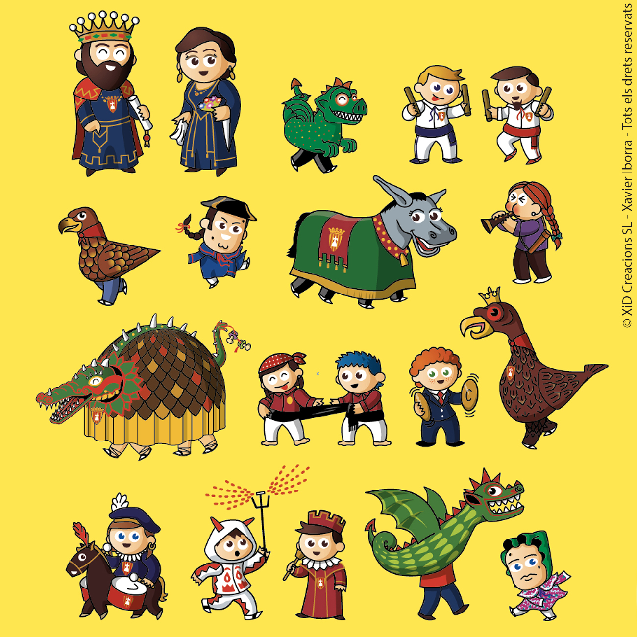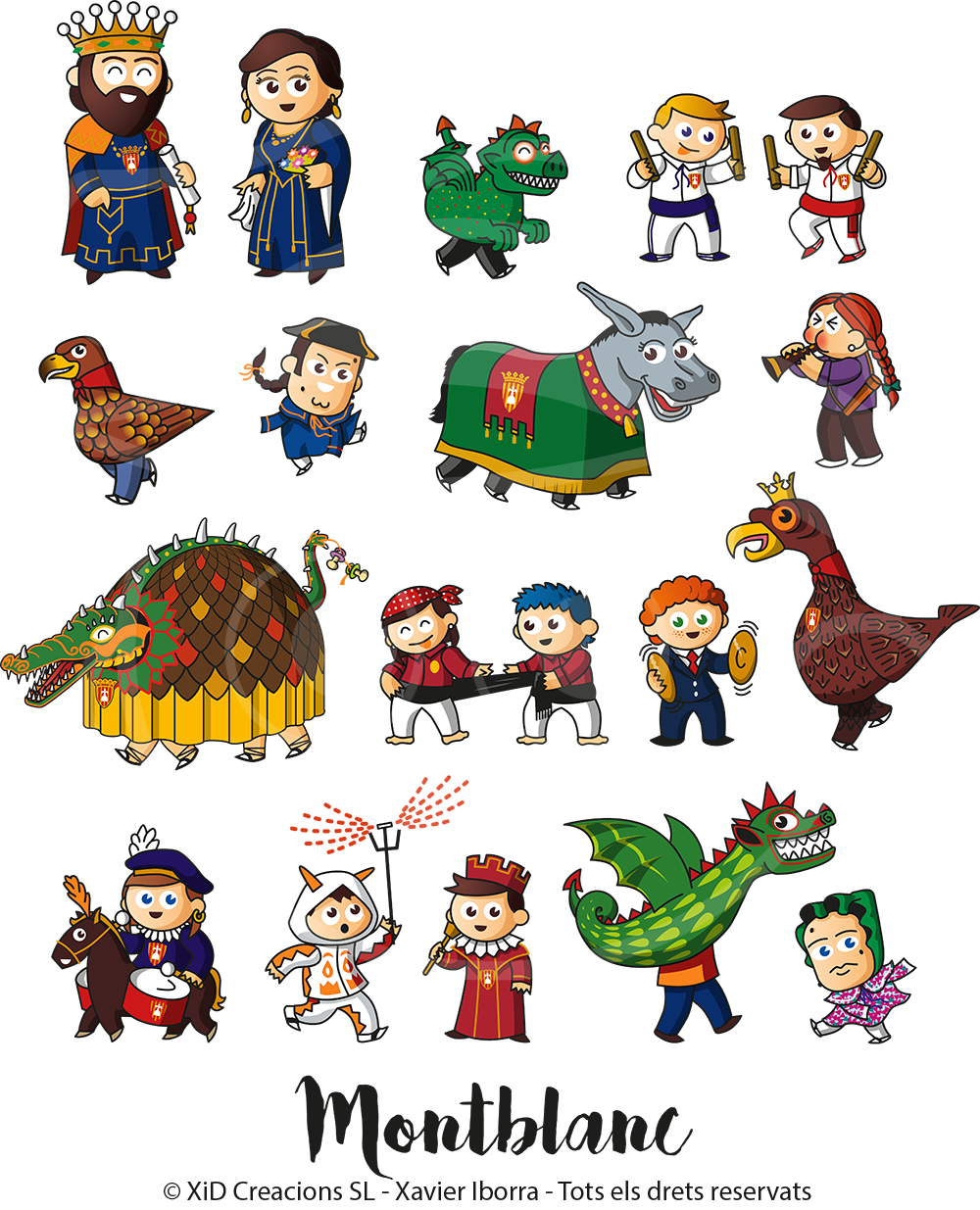 Els Gegants i nans de Montblanc, els Bastoners, l’Àliga, la Mulassa, la Cucafera, la colla castellera Torraires de Montblanc, la Banda Verge de la Serra, els Diables, els Macers, els Grallers, les Timbales i les besties del seguici petit: Drac petit i Aligot.