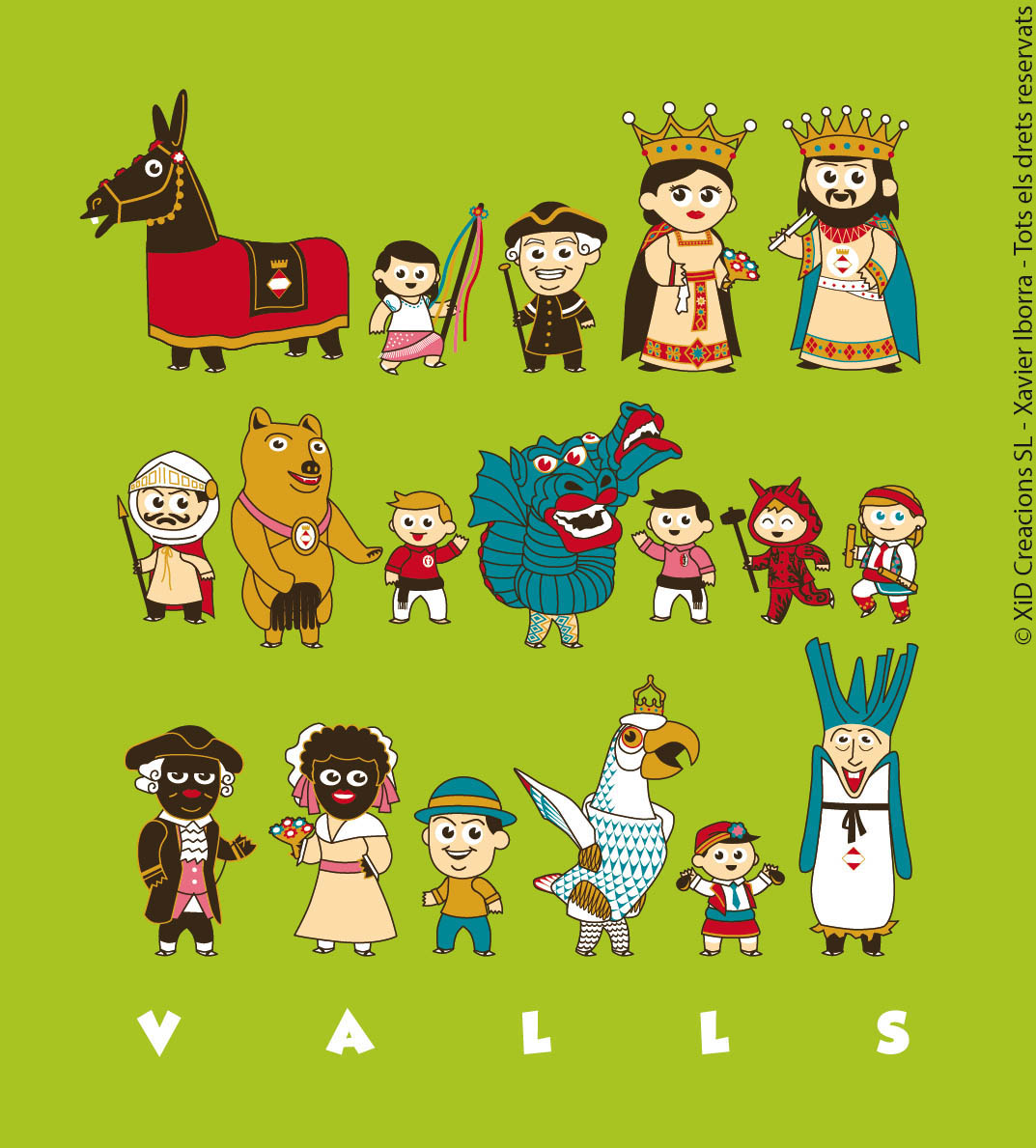 El Gegant de la Porra i la Geganta, els Gegantons lladrefaves, la mulassa, el Drac de Valls, el Ball de Diables, l’Ós, els Nans, el Ball de Gitanes, el Bou, El Bou tradicional, el Ball de Vells, el de Cercolets, el de Bastons, el ball de la Primera, la Moixiganga, els Xiquets de Valls i l’Àliga.
