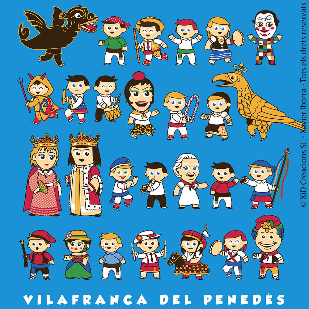 El Drac, els Diables, el ball d’en Serrallonga, l’Àliga, els Gegants de Vilafranca, els Nans, els Capgrossos, el ball de cotonines, el ball de Malcasats, el de Panderetes, el de Pastorets, el de Cercolets, el Ball Pla, el ball de figuetaires, el Ball de Bastoners, el de Panderos, els Falcons de Vilafranca, els Castellers de Vilafranca, Xicots de Vilafranca, la Colla Jove de Vilafranca, la Moixiganga i grallers.