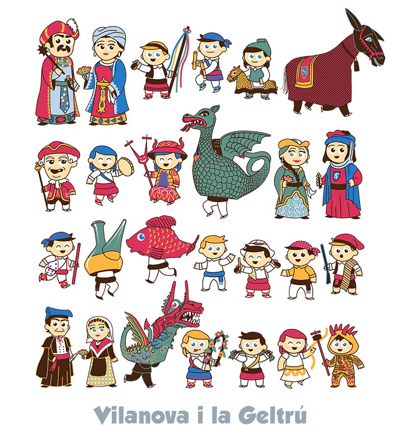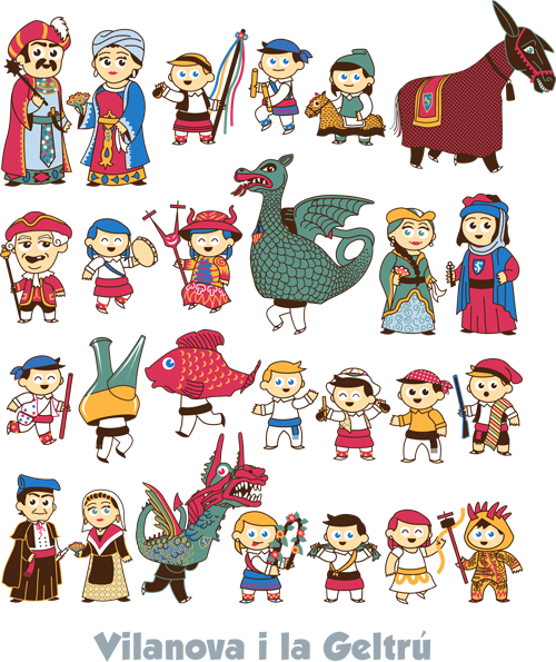 El Ball de diables de Vilanova i la Geltrú, el Drac de Vilanova i el Drac la Geltrú, la Carpa Juanita i el Porró, el Ball d’En Serrallonga, les Mulasses, Ball de Cotonines, Ball de Nans, Gegants Grossos, Gegants de la Geltrú i els Gegantons. Ball de cercolets, de pastorets, de panderos, de cintes, de gitanes, de valencians i de bastons, la Moixiganga de la Geltrú, els Falcons de Vilanova i els Bordegassos de Vilanova.